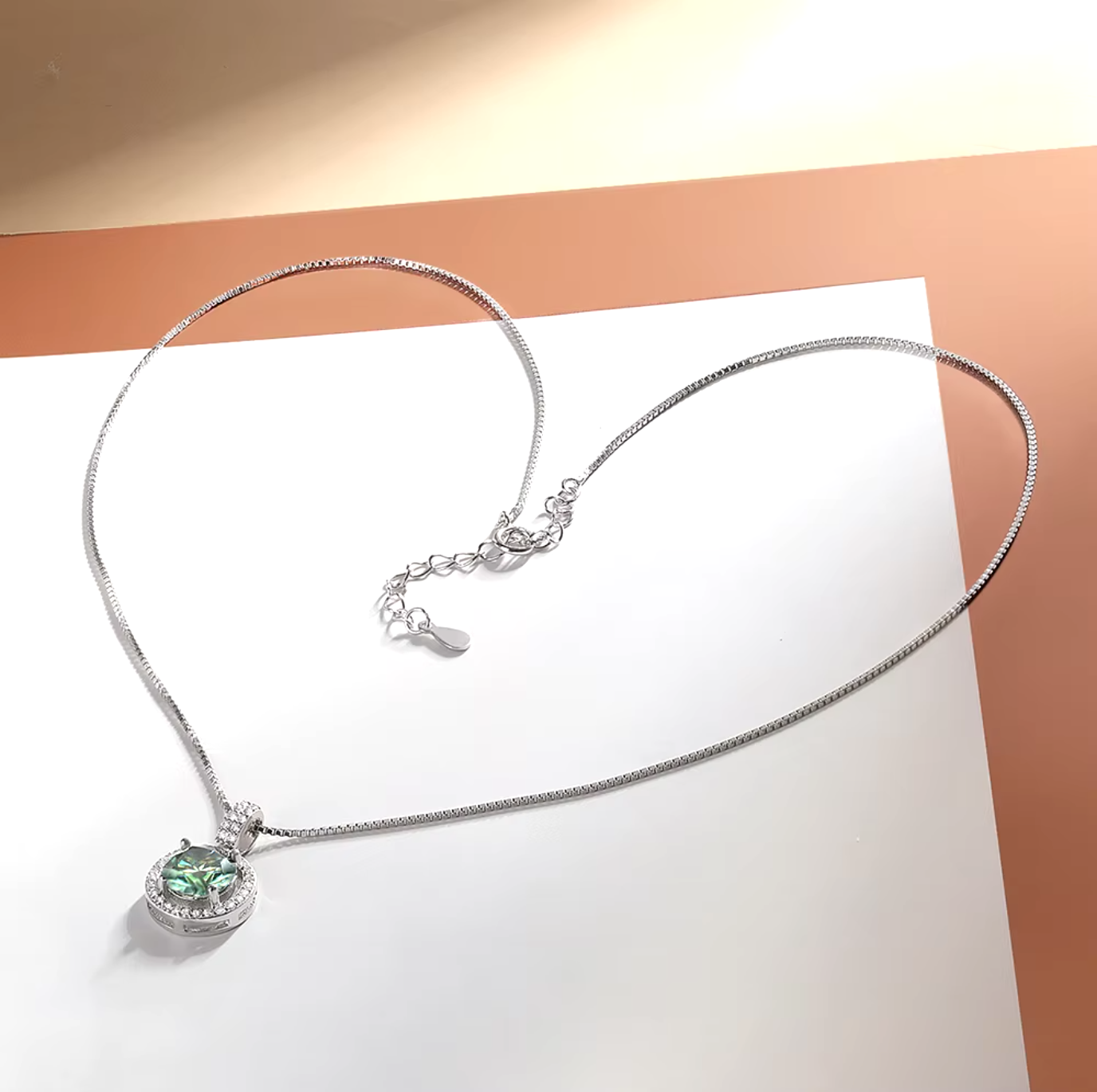 Elevate your style with the Serenity 2 carat green moissanite necklace, featuring a radiant heart-shaped pendant crafted from sterling silver and plated with 18K white gold. The centerpiece is a brilliant 2 carat green moissanite stone, offering a captivating sparkle that rivals natural diamonds. Perfect for weddings, parties, or birthdays, this necklace is a versatile accessory that adds a touch of elegance to any outfit.